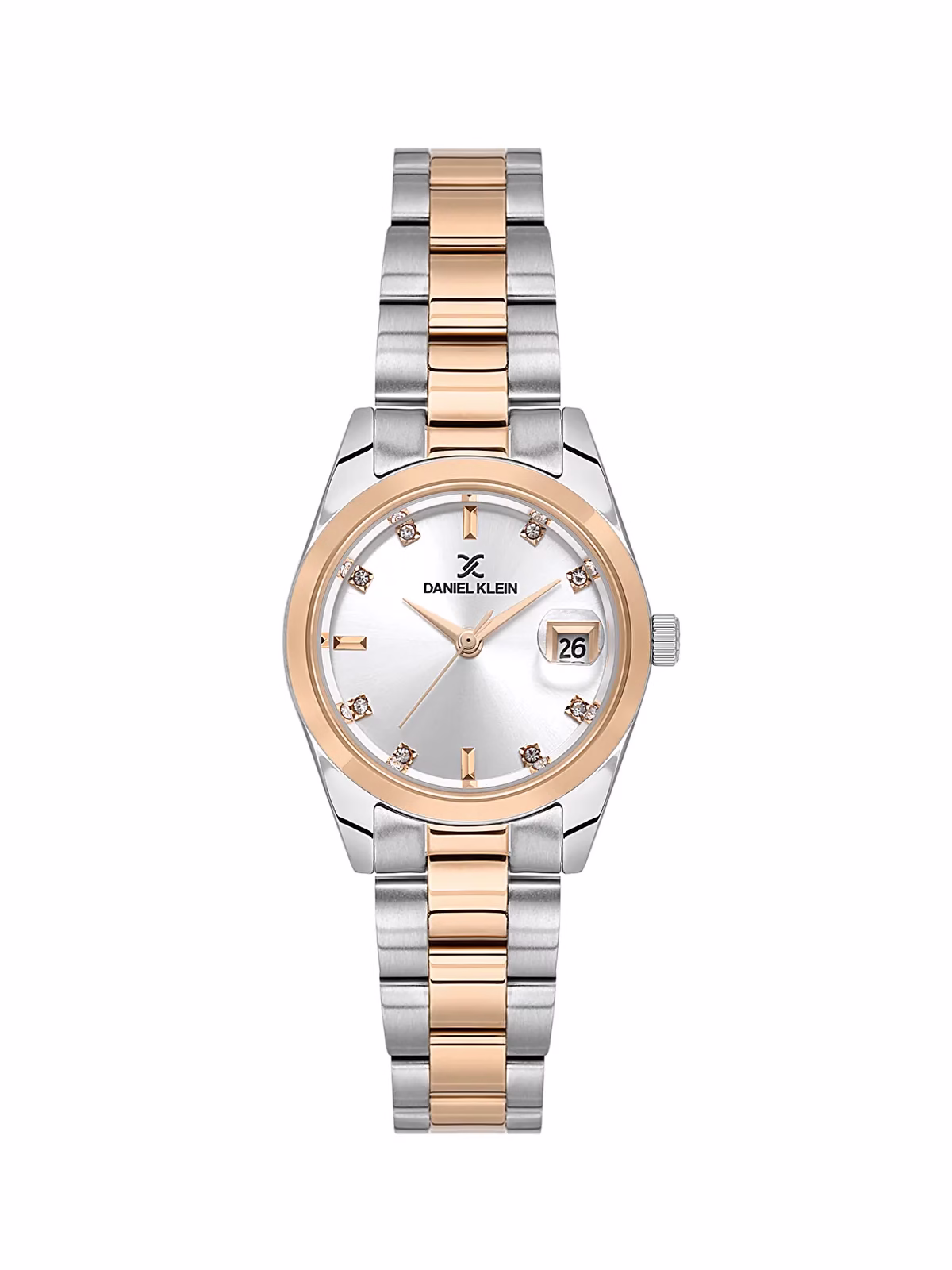Daniel Klein DKE.1.10841‑6, Premium koleksiyonunun zarif ve feminen bir parçasıdır. Metal / çelik kasası rose‑gold tonu ile şık bir görünüm sunarken, gri tonlu bilezik saatin modern ve dengeli duruşunu güçlendirir. İnce ve yuvarlak formdaki kasa, kadın bileğine şık bir uyum sağlar. Quartz mekanizması sayesinde yüksek doğrulukta zaman ölçümü mümkündür. Mineral cam, günlük kullanımda meydana gelebilecek çizilmelere karşı dayanıklılık sağlar. 3 ATM su geçirmezlik seviyesi, el yıkama ve hafif su sıçramaları gibi durumlarda güvenli kullanım sağlar.