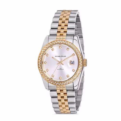 Michael Fellini 2222‑9 Kadın Kol Saati; paslanmaz çelik kasası, taşlı çerçevesi, quartz mekanizması ve 3 ATM su geçirmezliğiyle zarif ve işlevsel bir kadın saati modelidir.