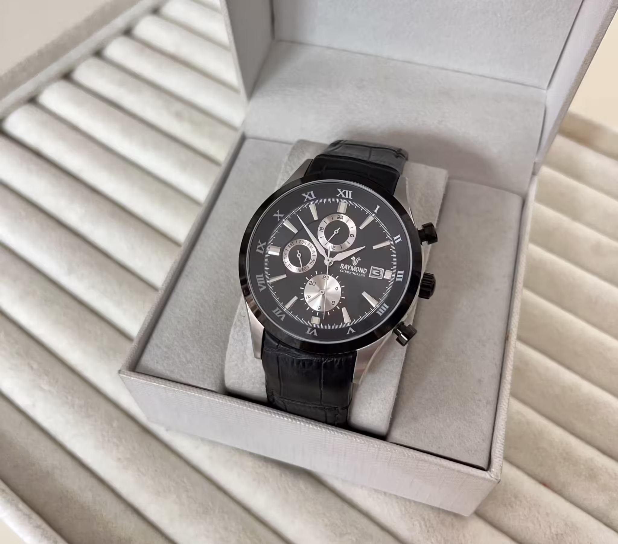 Modern ve klasik tasarımı, günlük kullanım ve iş ortamları için uygundur. Hafif ve ergonomik yapısı bilekte konfor sağlar. Raymond A3369M, deri kayış ve paslanmaz çelik kasa ile uzun ömürlü ve güvenilir bir kullanım sunar.