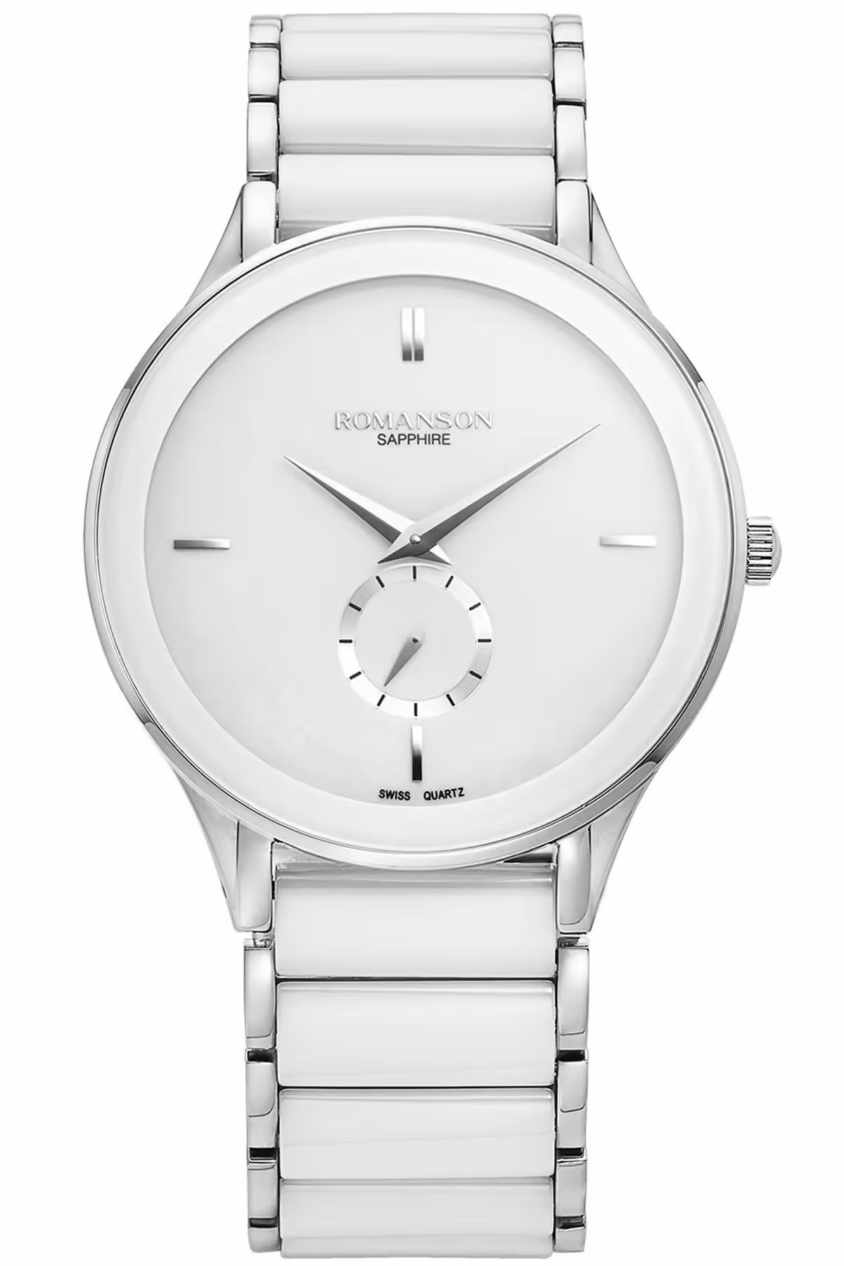 Romanson TM4236CM2WA12W, minimalist zarafeti modern detaylarla birleştiren bir erkek kol saatidir. 42 mm çapındaki paslanmaz çelik kasası, beyaz kadranı ve çelik-seramik bilezik kombinasyonu ile hem ofis ortamında hem de özel davetlerde şık bir görünüm sunar. Safir cam sayesinde yüzey çizilmelerine karşı ekstra koruma sağlanırken, quartz mekanizma yüksek doğrulukta zaman ölçümünü garantiler.